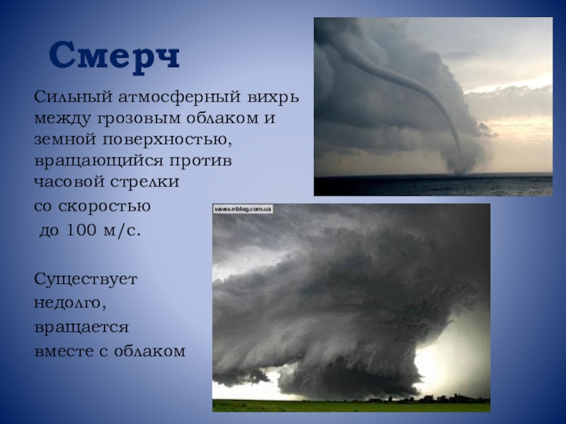 СмерчСильный атмосферный вихрь между грозовым облаком и земной поверхностью, вращающийся против часовой стрелки со скоростью до 100
