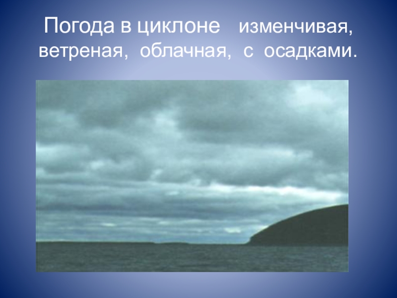 Слайд 9 Погода в циклоне изменчивая, ветреная, облачная, с осадками. .