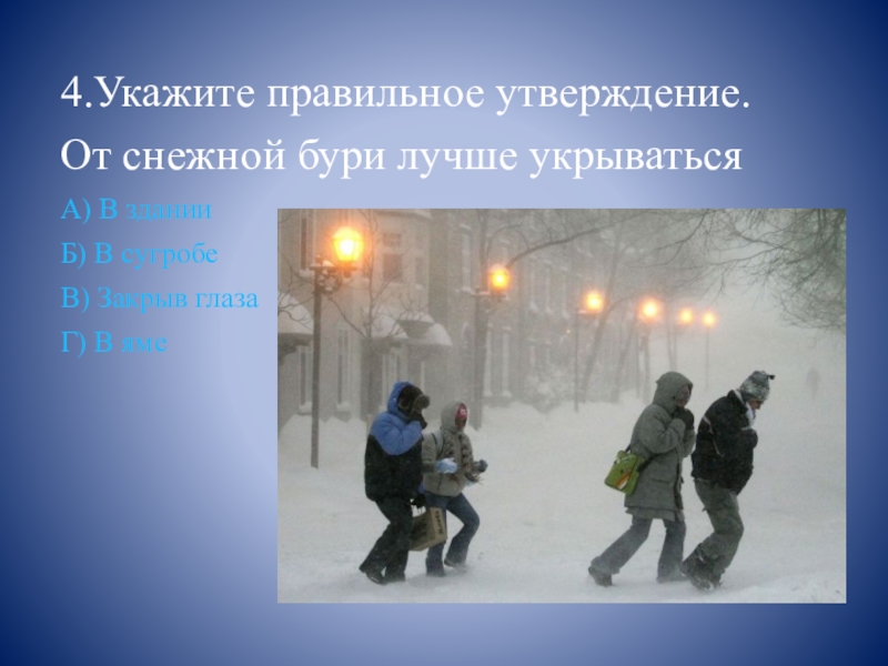 4.Укажите правильное утверждение.От снежной бури лучше укрыватьсяА) В зданииБ) В сугробеВ) Закрыв глазаГ) В яме