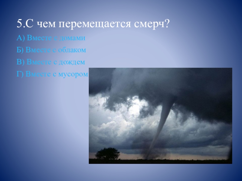 5.С чем перемещается смерч? А) Вместе с домамиБ) Вместе с облакомВ) Вместе с дождемГ) Вместе с мусором