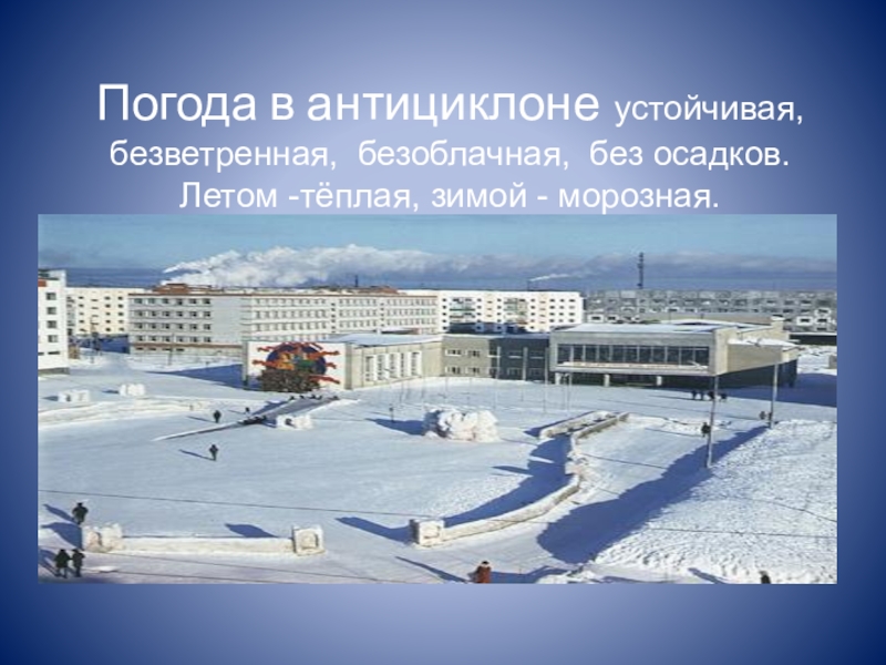 Слайд 8 Погода в антициклоне устойчивая, безветренная, безоблачная, без осадков. Летом -тёплая, зимой