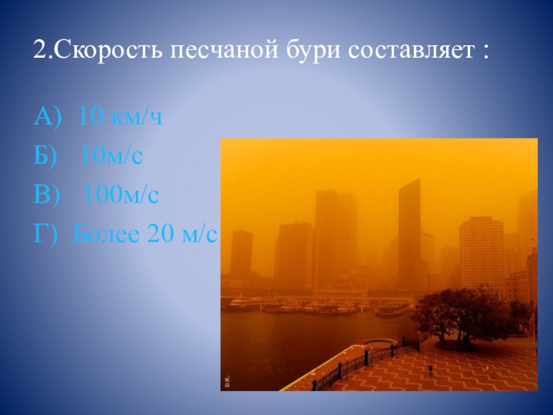 2.Скорость песчаной бури составляет :А) 10 км/чБ)  10м/сВ)  100м/сГ) Более 20 м/с