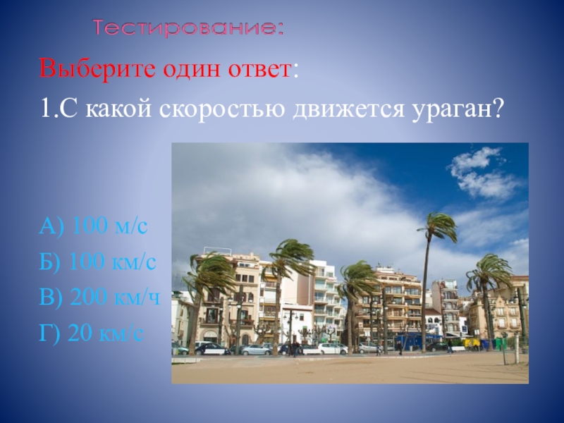 Выберите один ответ:1.С какой скоростью движется ураган?А) 100 м/сБ) 100 км/сВ) 200 км/чГ) 20 км/с