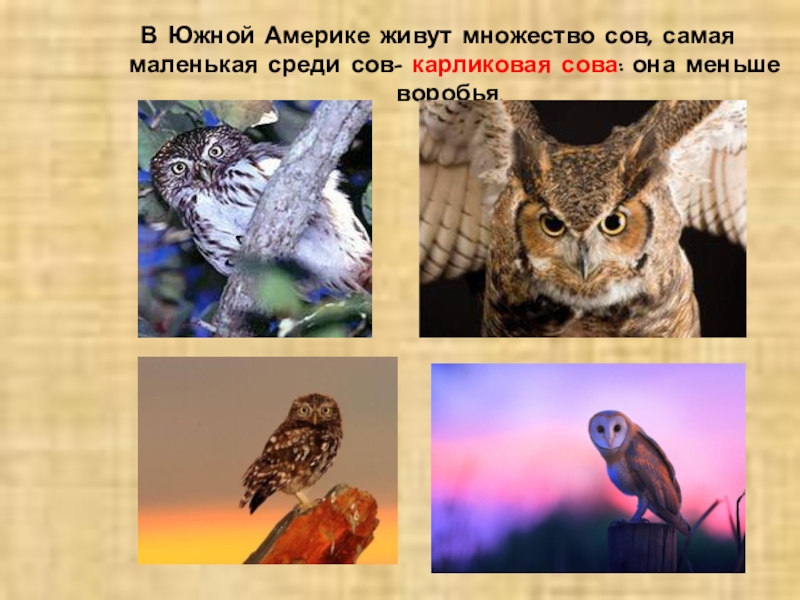 Слайд 29В Южной Америке живут множество сов, самая маленькая среди сов- карликовая