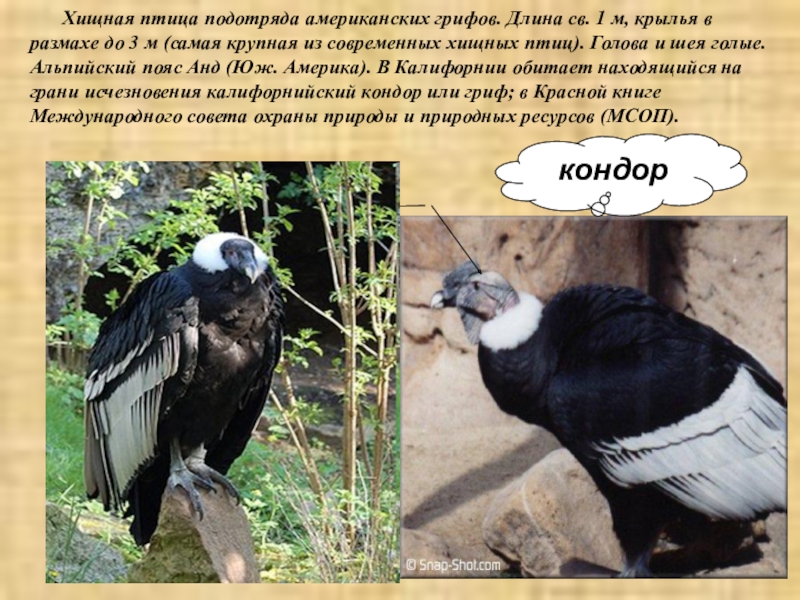 м, крылья в размахе до 3 м (самая крупная из современных хищных птиц). Голова и шея голые. Альпийский пояс Анд (Юж. Америка). В Калифорнии обитает находящийся на грани исчезновения калифорнийский кондор или гриф; в Красной книге Международного совета охраны природы и природных ресурсов (МСОП).