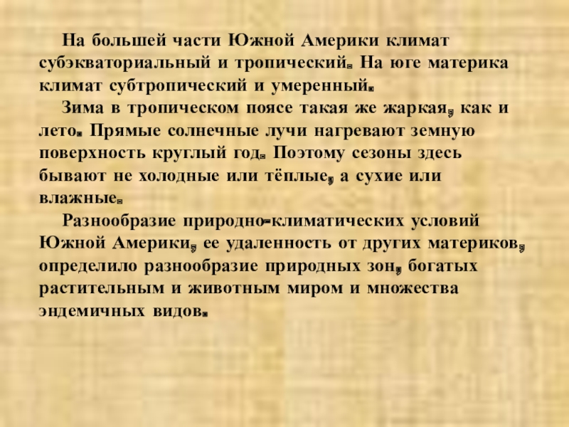 Слайд 5На большей части Южной Америки климат субэкваториальный и тропический. На юге