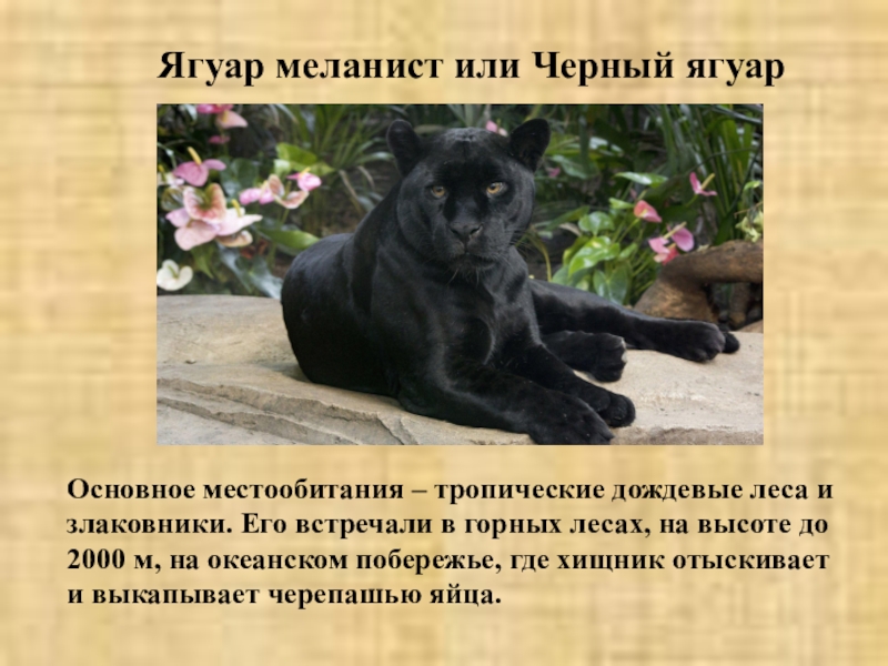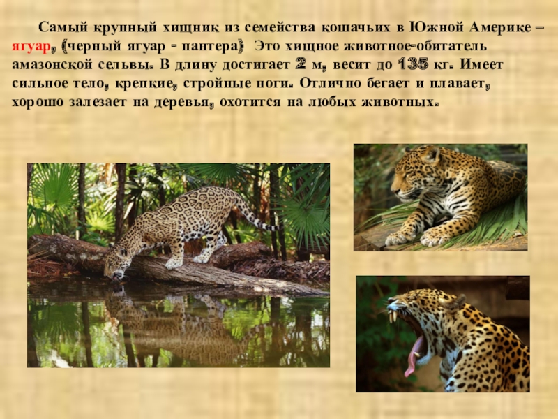 Америке – ягуар, (черный ягуар - пантера) Это хищное животное-обитатель амазонской сельвы. В длину достигает 2 м, весит до 135 кг. Имеет сильное тело, крепкие, стройные ноги. Отлично бегает и плавает, хорошо залезает на деревья, охотится на любых животных.