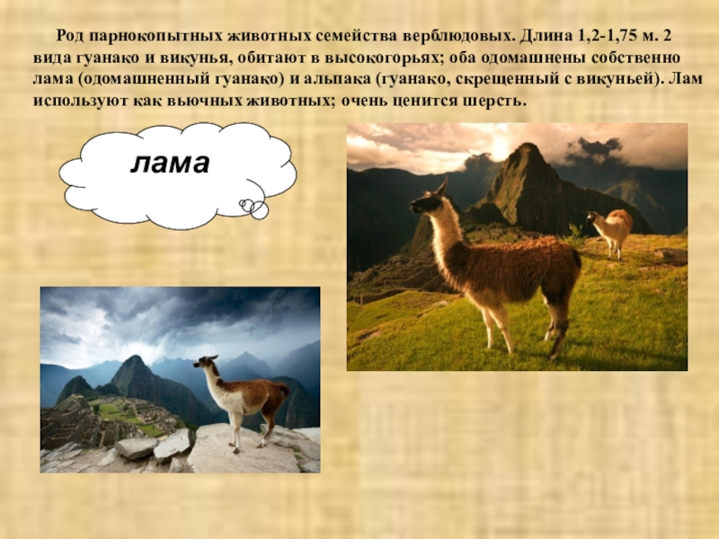 Род парнокопытных животных семейства верблюдовых. Длина 1,2-1,75 м.