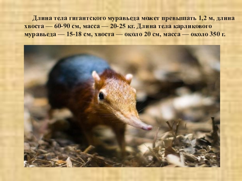 Слайд 23 Длина тела гигантского муравьеда может превышать 1,2 м,