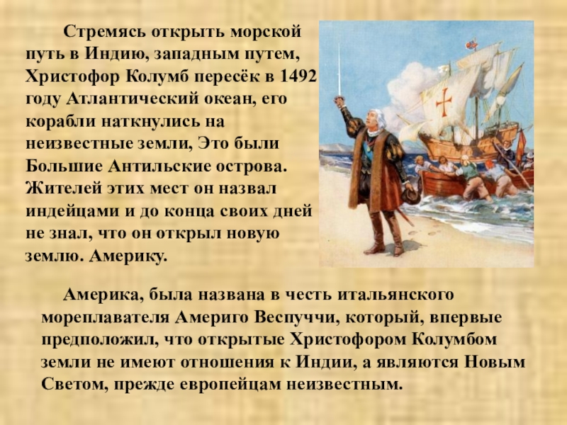 путем, Христофор Колумб пересёк в 1492 году Атлантический океан, его корабли наткнулись на неизвестные земли, Это были Большие Антильские острова. Жителей этих мест он назвал индейцами и до конца своих дней не знал, что он открыл новую землю. Америку.