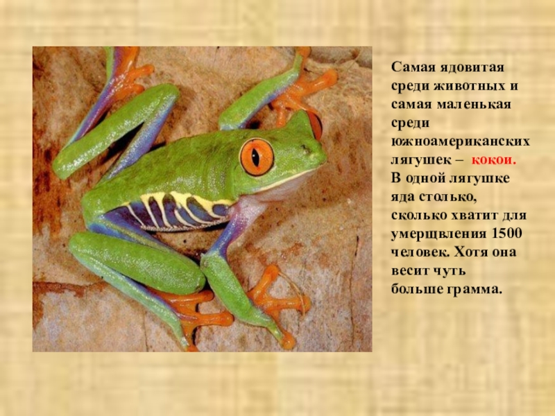 Слайд 26Самая ядовитая среди животных и самая маленькая среди южноамериканских лягушек –