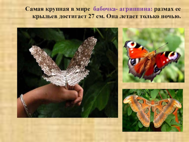 Слайд 30Самая крупная в мире бабочка- агриппина: размах ее крыльев достигает 27
