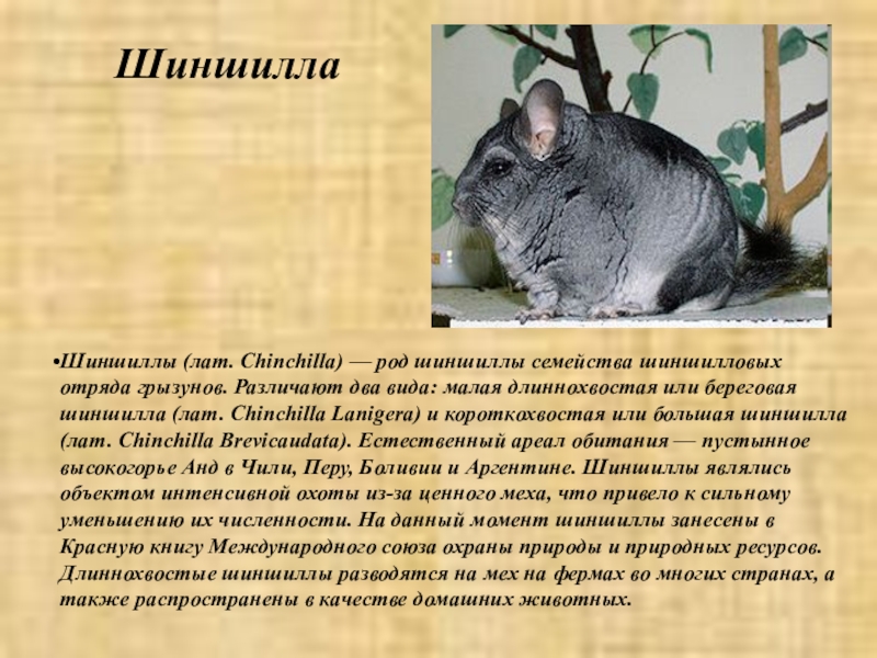 Шиншиллы (лат. Chinchilla) — род шиншиллы семейства шиншилловых отряда грызунов. Различают