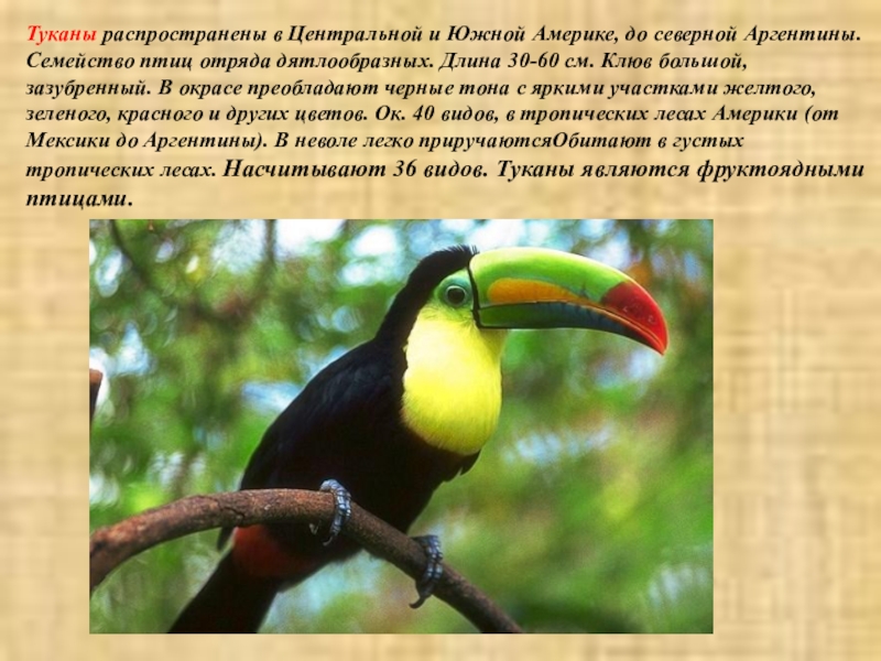 Слайд 41Туканы распространены в Центральной и Южной Америке, до северной Аргентины. Семейство