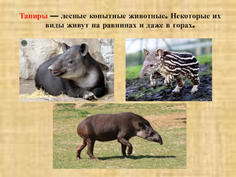 Слайд 19Тапиры — лесные копытные животные. Некоторые их виды живут на равнинах