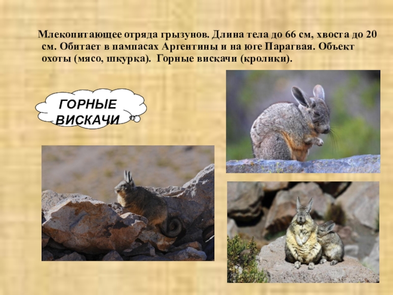 до 20 см. Обитает в пампасах Аргентины и на юге Парагвая. Объект охоты (мясо, шкурка). Горные вискачи (кролики).