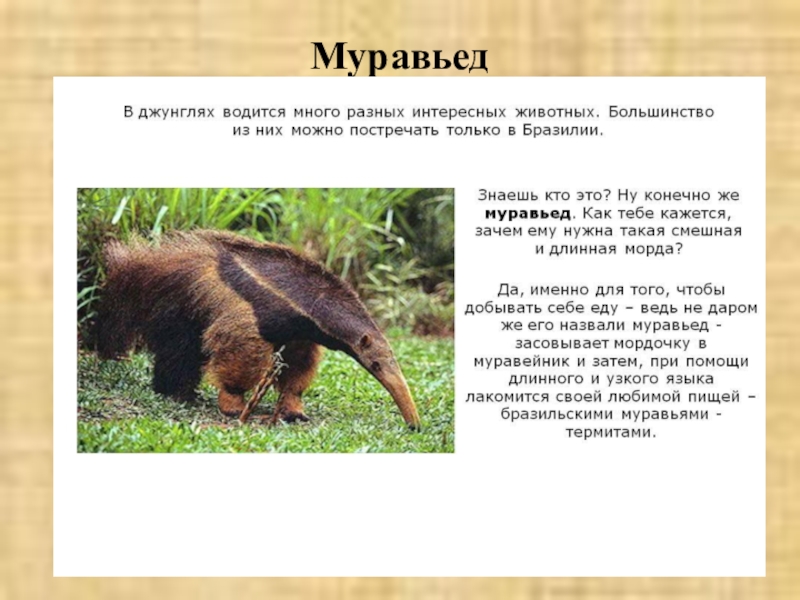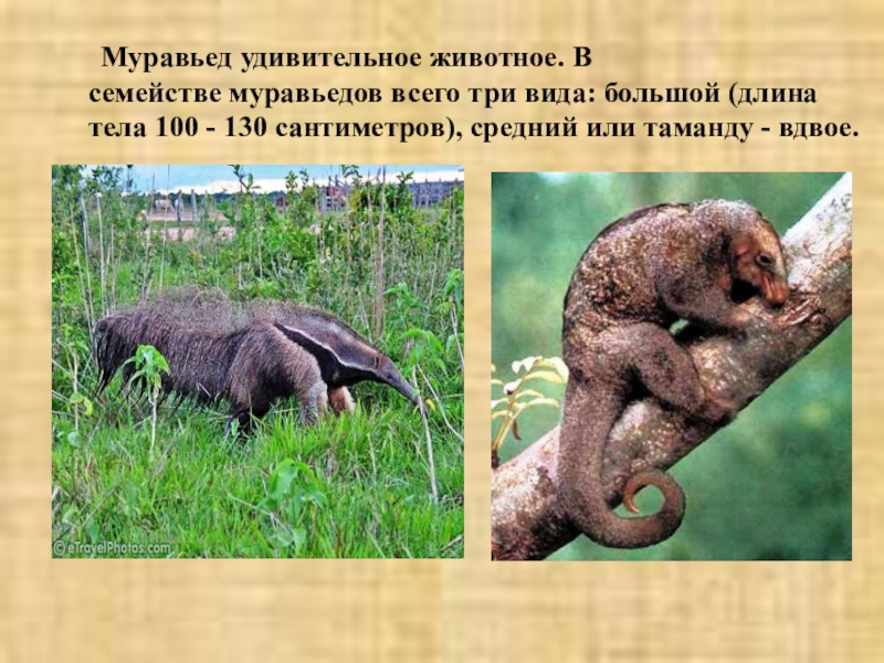Слайд 24 Муравьед удивительное животное. В семействе муравьедов всего три вида: большой (длина тела