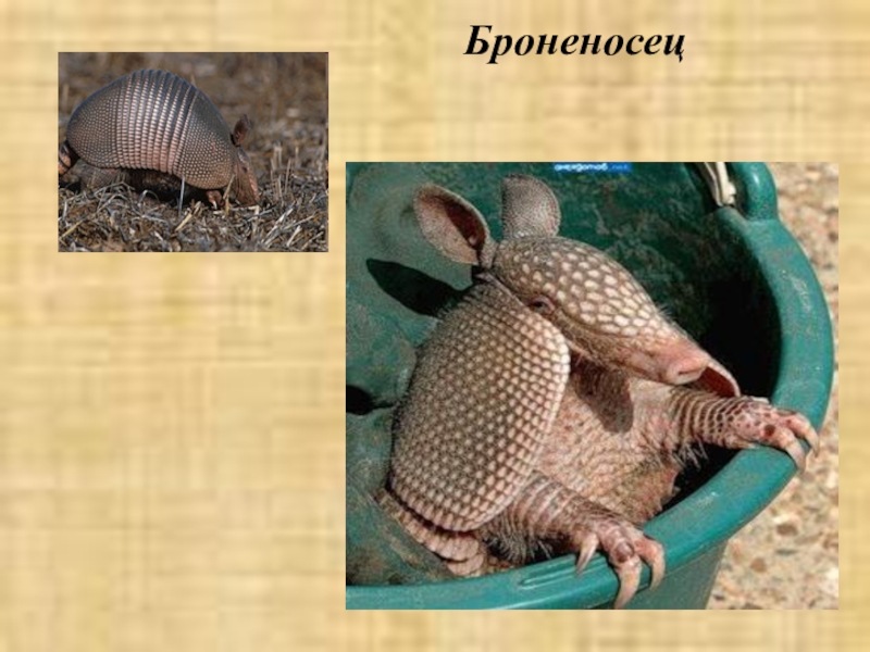 Слайд 33В лесах Южной Америки живут броненосцы, ленивцы и муравьеды. Тело броненосца покрыто панцирем, немного напоминающим щит черепахи. Панцирь
