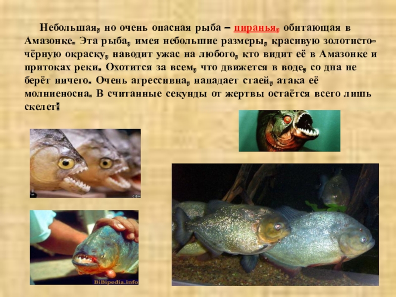 Слайд 20 Небольшая, но очень опасная рыба – пиранья, обитающая