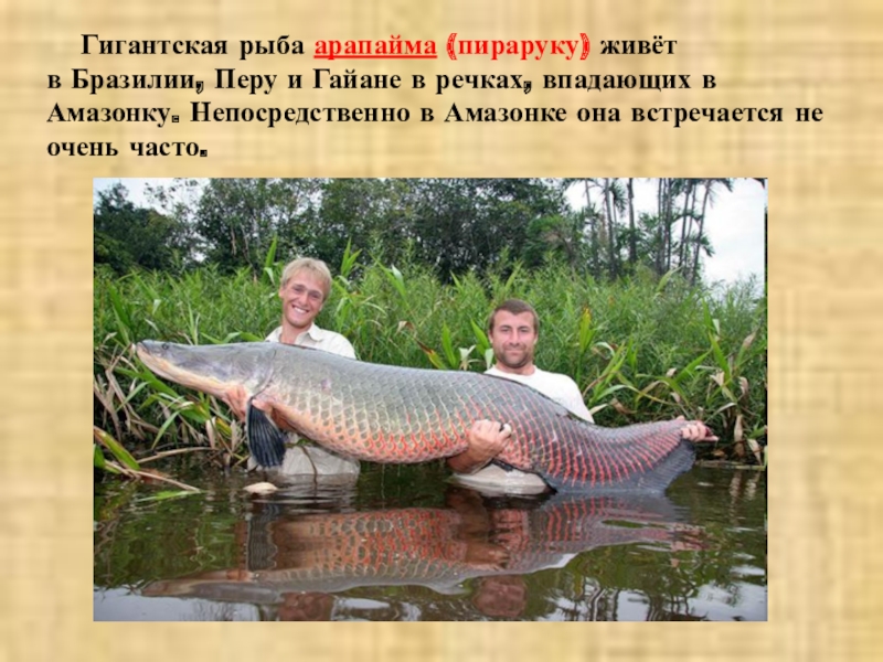 Слайд 21Гигантская рыба арапайма (пираруку) живёт