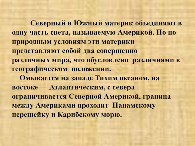 света, называемую Америкой. Но по природным условиям эти материки представляют собой два совершенно различных мира, что обусловлено различиями в географическом положении.