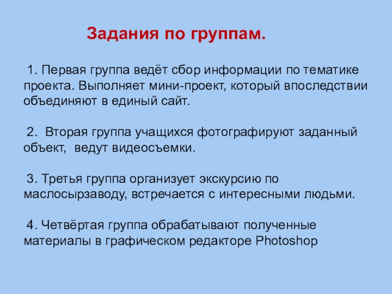 1. Первая группа ведёт сбор информации по тематике проекта. Выполняет мини-проект, который впоследствии объединяют в единый сайт.