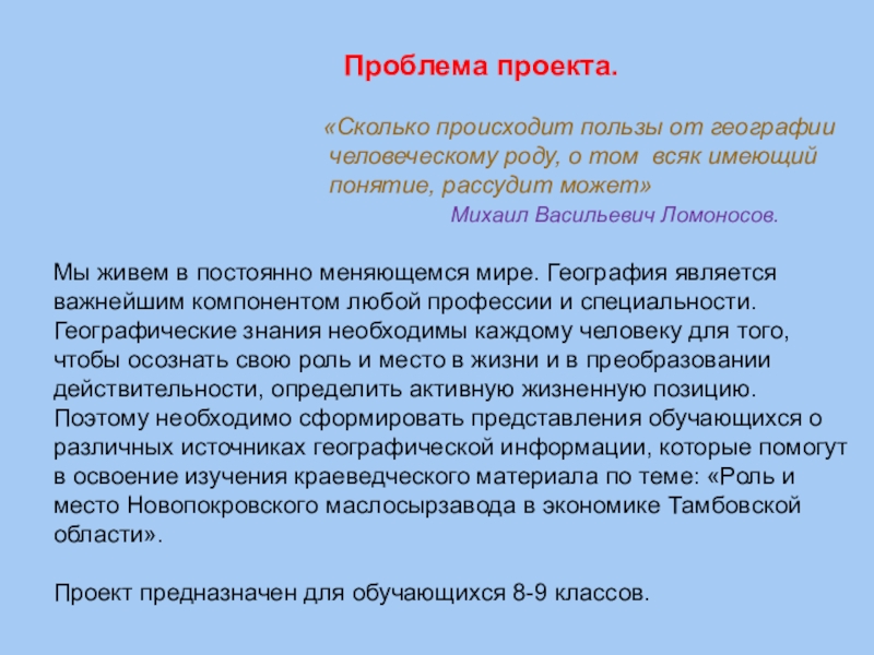 Географические знания необходимы каждому человеку для того, чтобы осознать свою роль и место в жизни и в преобразовании действительности, определить активную жизненную позицию.