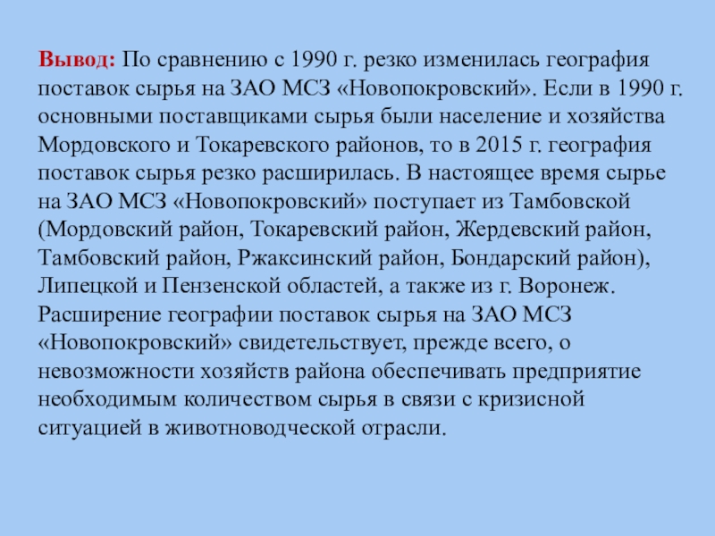 Расширение географии поставок сырья на ЗАО МСЗ «Новопокровский» свидетельствует, прежде всего, о невозможности хозяйств района обеспечивать предприятие необходимым количеством сырья в связи с кризисной ситуацией в животноводческой отрасли.