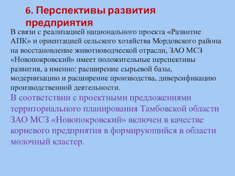 и ориентацией сельского хозяйства Мордовского района на восстановление животноводческой отрасли, ЗАО МСЗ «Новопокровский» имеет положительные перспективы развития, а именно: расширение сырьевой базы, модернизацию и расширение производства, диверсификацию производственной деятельности.