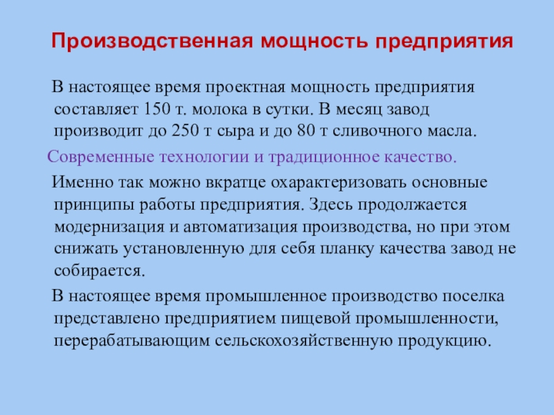 составляет 150 т. молока в сутки. В месяц завод производит до 250 т сыра и до 80 т сливочного масла.