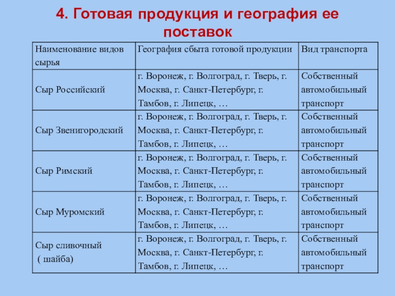 Готовая продукция доставляется к потребителю автомобильным транспортом. Основные направления поставок продукции предприятия – города европейской части России (г. Воронеж, г. Волгоград, г. Тверь, г. Москва, г. Санкт-Петербург, г. Тамбов, г. Липецк и т.д.).
