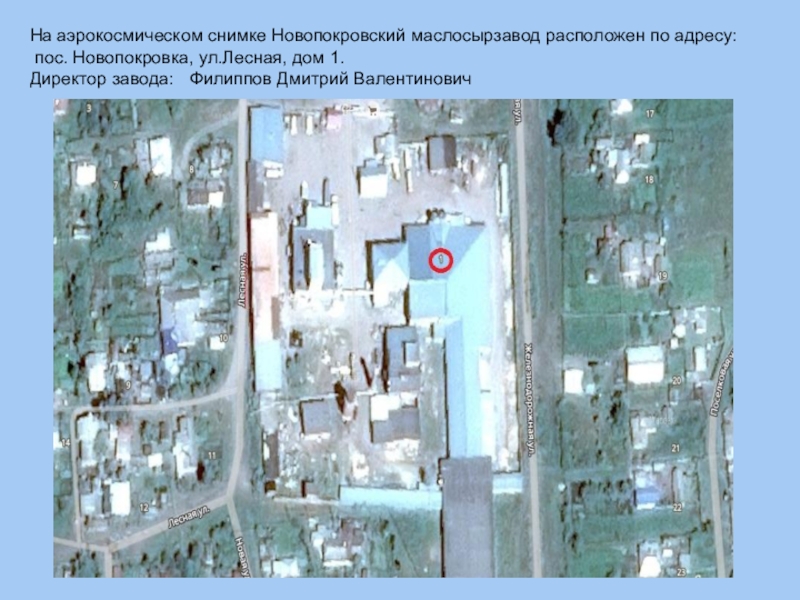 Слайд 7На аэрокосмическом снимке Новопокровский маслосырзавод расположен по адресу: