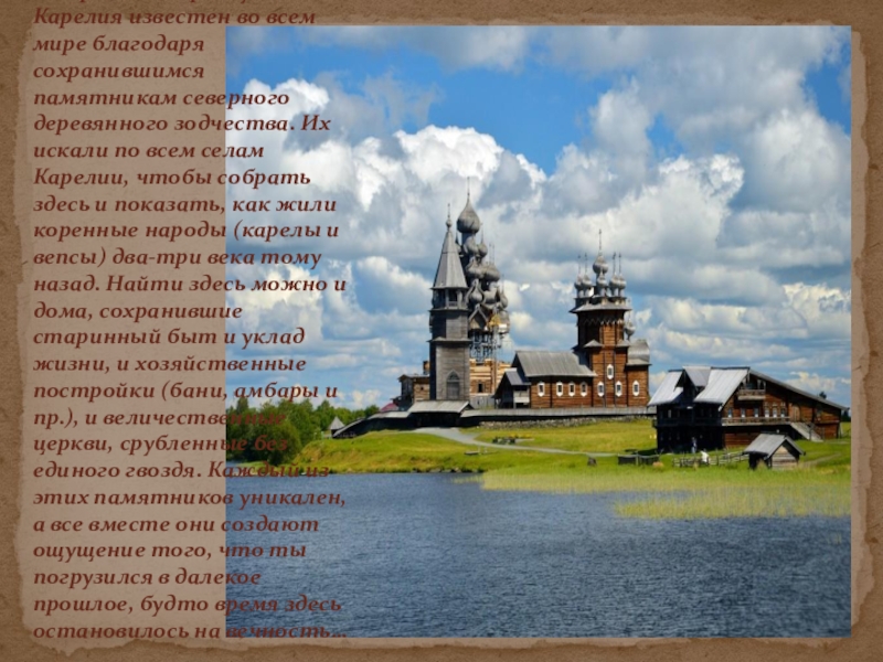 Слайд 5Остров Кижи республики Карелия известен во всем мире благодаря сохранившимся памятникам