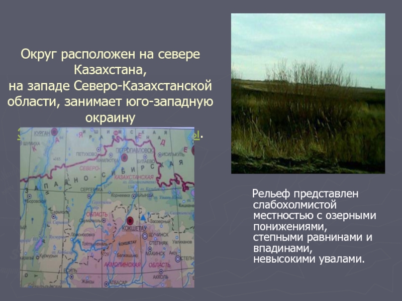 Рельеф представлен слабохолмистой местностью с озерными понижениями, степными равнинами и впадинами, невысокими увалами.