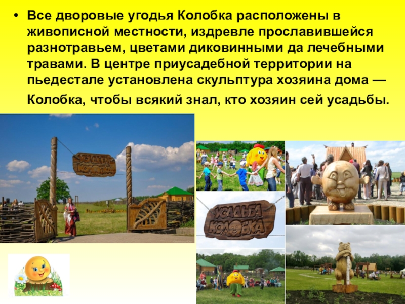 Слайд 46Все дворовые угодья Колобка расположены в живописной местности, издревле прославившейся разнотравьем,