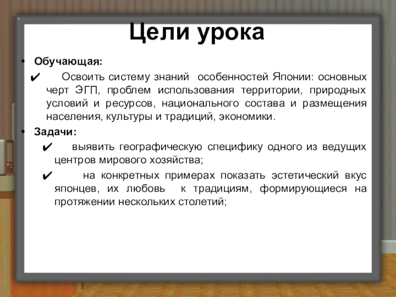 Цели урокаОбучающая:  Освоить систему знаний особенностей Японии: основных черт ЭГП, проблем использования территории, природных условий и