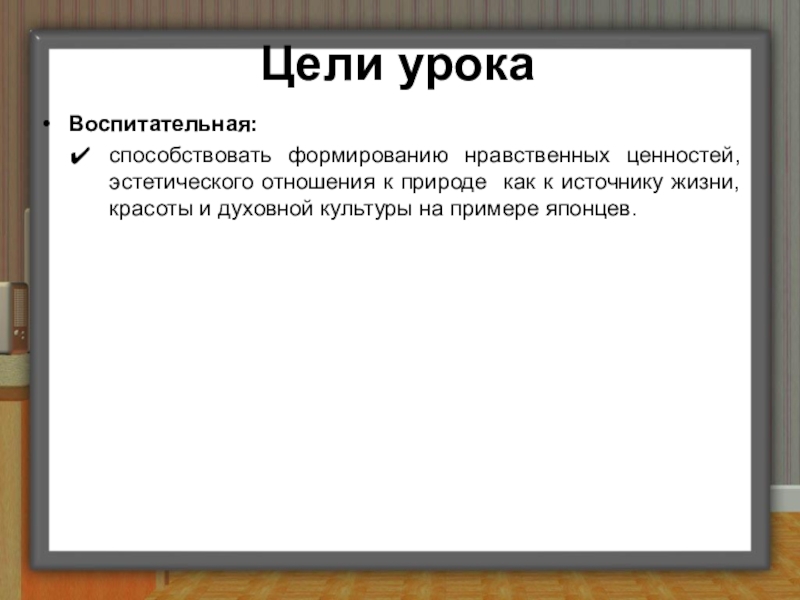 Цели урокаВоспитательная:способствовать формированию нравственных ценностей, эстетического отношения к природе как к источнику жизни, красоты и духовной культуры