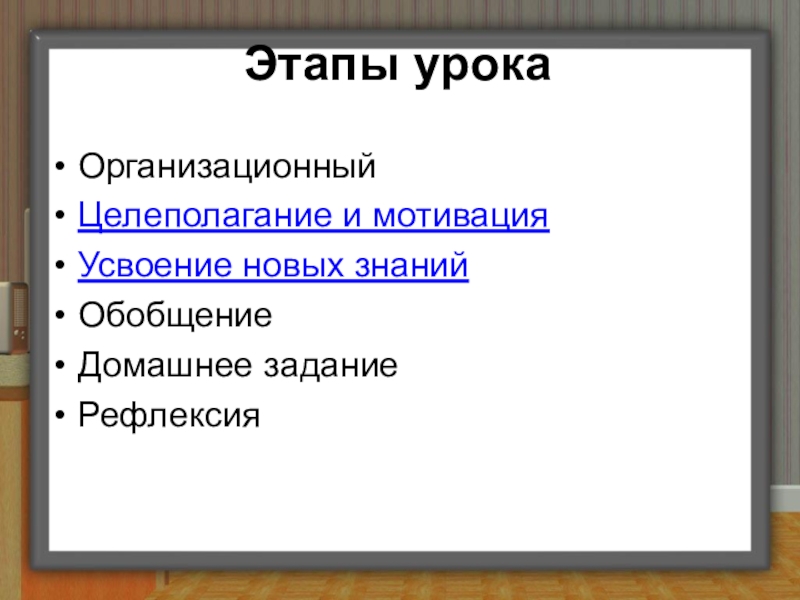 Этапы урокаОрганизационный Целеполагание и мотивацияУсвоение новых знанийОбобщениеДомашнее заданиеРефлексия