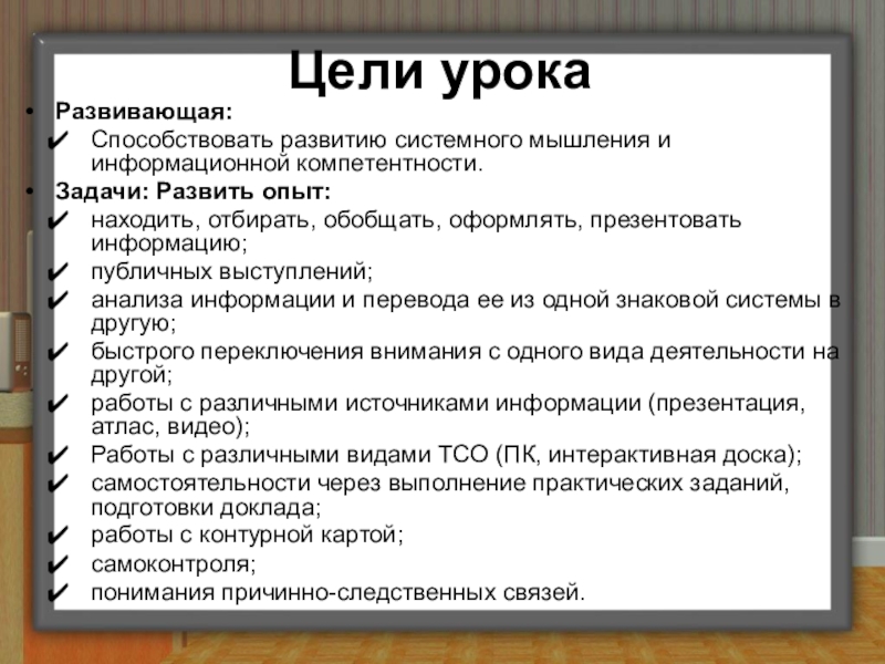 Цели урокаРазвивающая:Способствовать развитию системного мышления и информационной компетентности.Задачи: Развить опыт:находить, отбирать, обобщать, оформлять, презентовать информацию;публичных выступлений;анализа информации