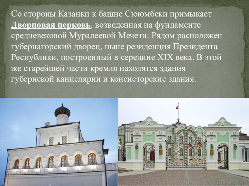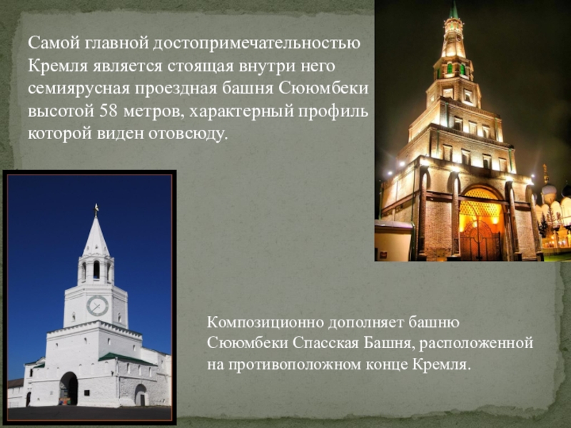 Композиционно дополняет башню Сююмбеки Спасская Башня, расположенной на противоположном конце Кремля.