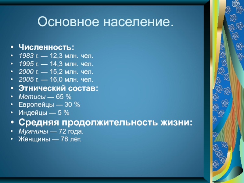 Основное население. Численность:1983 г. — 12,3 млн. чел. 1995 г. — 14,3 млн. чел. 2000 г. — 15,2 млн. чел. 2005 г. — 16,0 млн. чел.Этнический состав:Метисы — 65 % Европейцы —