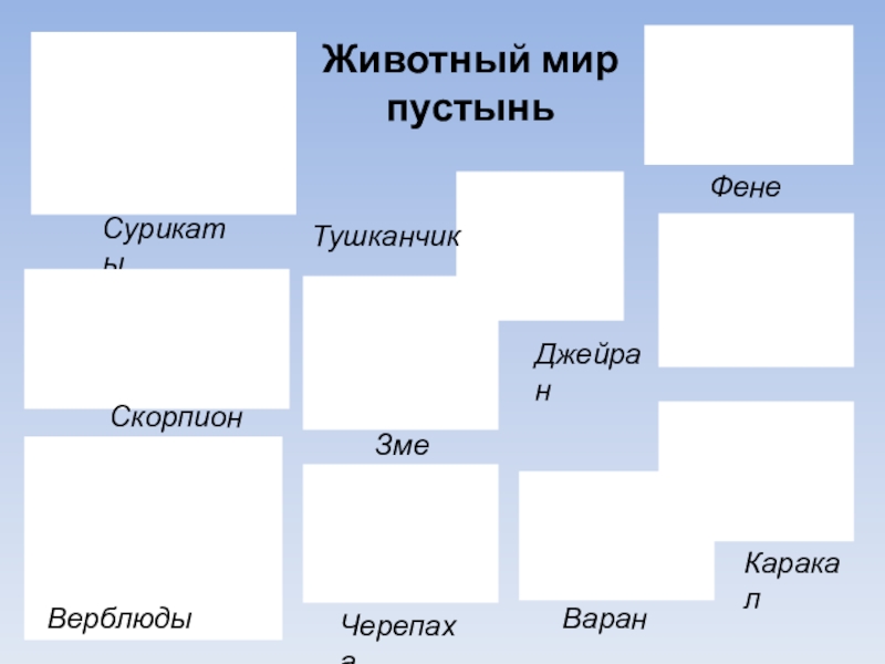 Животный мир пустыньСурикатыСкорпионТушканчикВерблюдыЗмеиЧерепаха  ВаранФенекДжейранКаракал