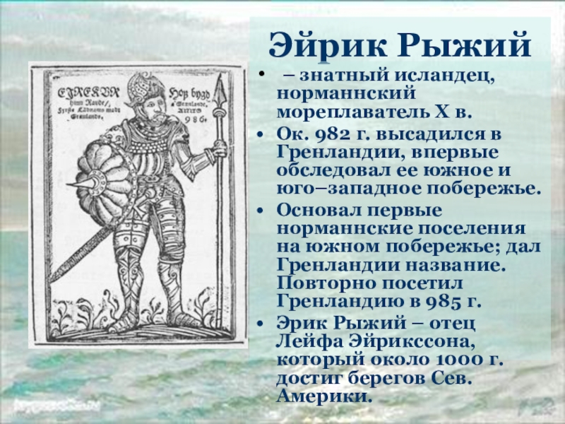 Эрик Рыжий – отец Лейфа Эйрикссона, который около 1000 г. достиг берегов Сев. Америки.