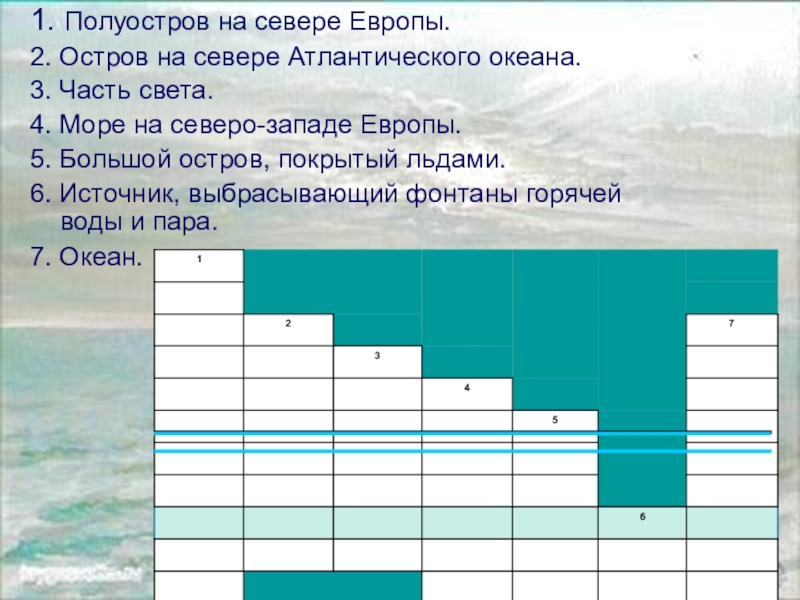 1. Полуостров на севере Европы.2. Остров на севере Атлантического океана.3. Часть света.4. Море на северо-западе Европы.5. Большой остров, покрытый льдами.6. Источник, выбрасывающий фонтаны горячей воды и пара.7. Океан.
