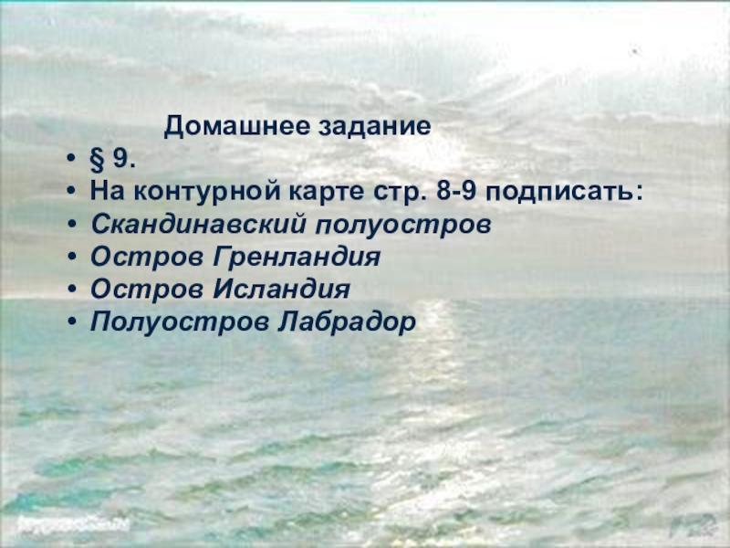 Домашнее задание§ 9.На контурной карте стр. 8-9 подписать:Скандинавский полуостровОстров ГренландияОстров