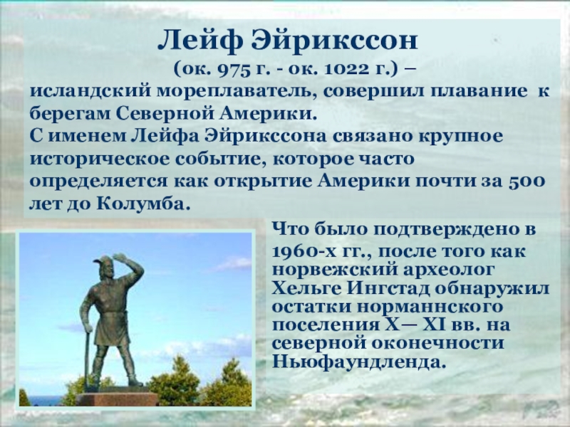 С именем Лейфа Эйрикссона связано крупное историческое событие, которое часто определяется как открытие Америки почти за 500 лет до Колумба.