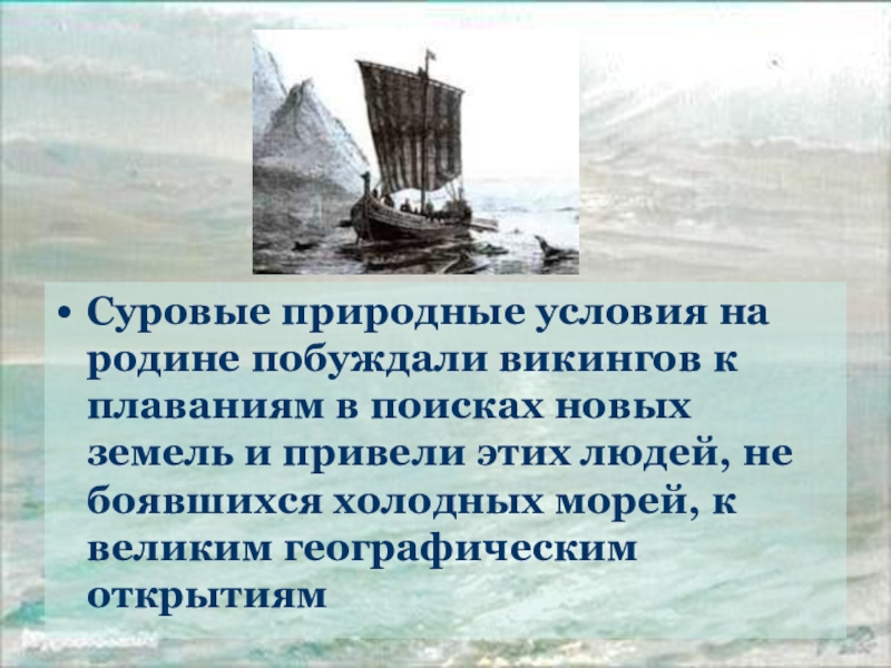 Слайд 8Суровые природные условия на родине побуждали викингов к плаваниям в поисках