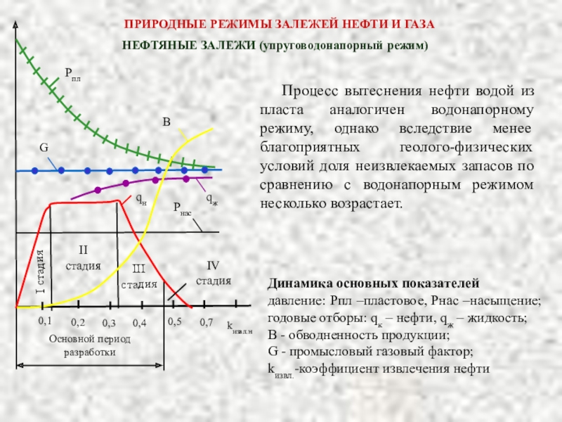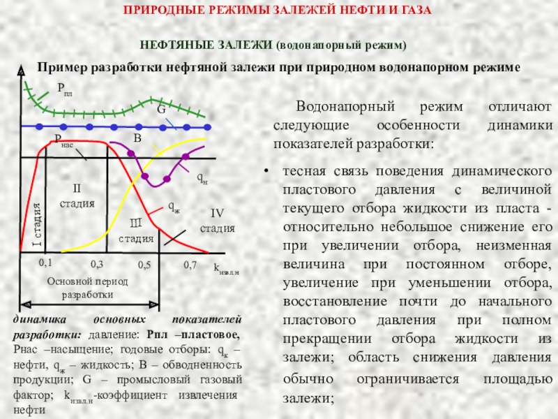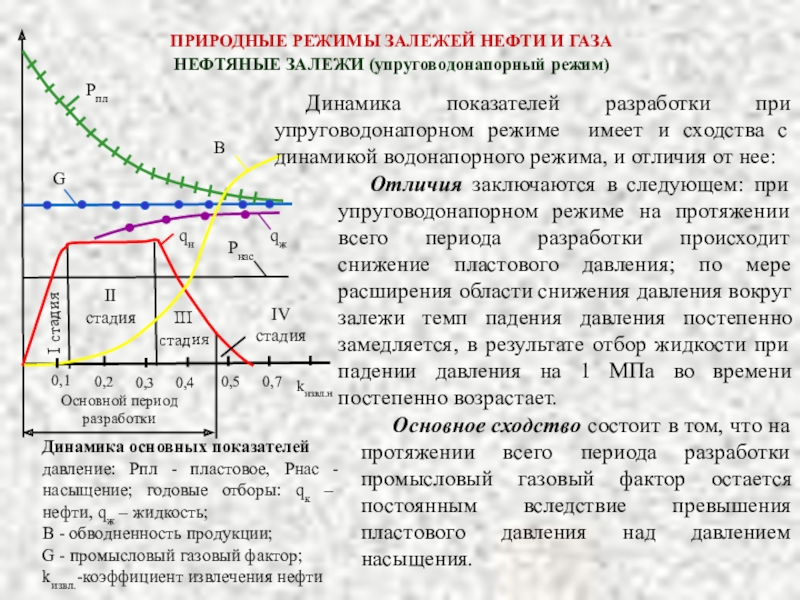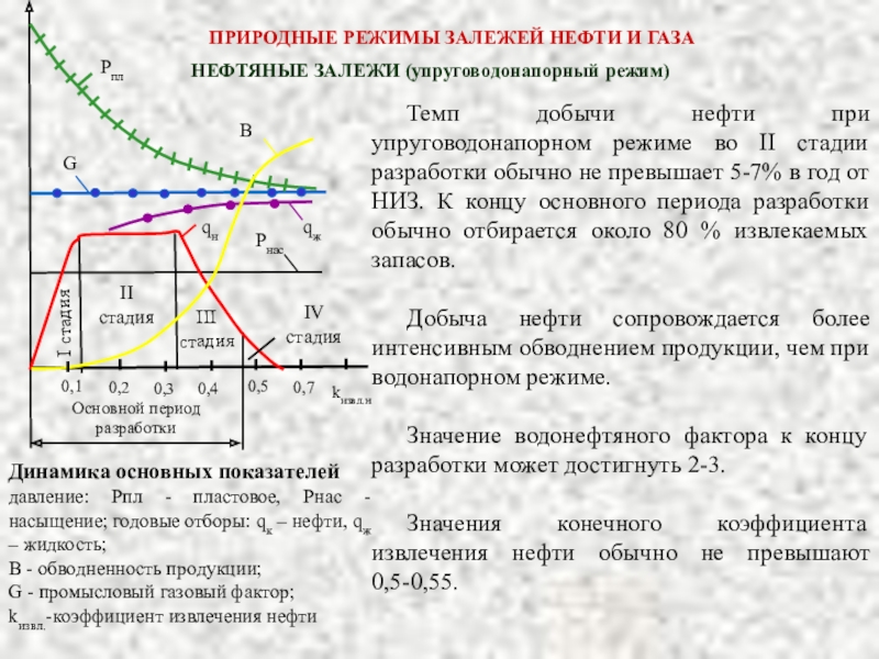 Темп добычи нефти при упруговодонапорном режиме во II стадии разработки обычно не превышает 5-7% в год от НИЗ. К концу основного периода разработки обычно отбирается около 80 % извлекаемых запасов.