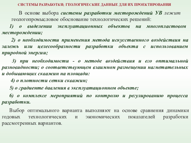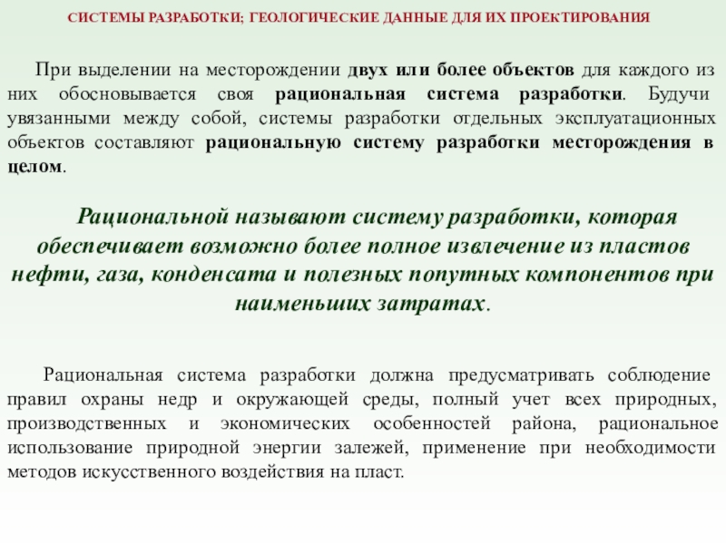 Рациональная система разработки должна предусматривать соблюдение правил охраны недр и окружающей среды, полный учет всех природных, производственных и экономических особенностей района, рациональное использование природной энергии залежей, применение при необходимости методов искусственного воздействия на пласт.