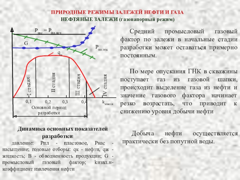 давление: Рпл –пластовое, Рнас –насыщение; годовые отборы: qк – нефти, qж – жидкость; В – обводненность продукции; G – промысловый газовый фактор; kизвл.н-коэффициент извлечения нефти